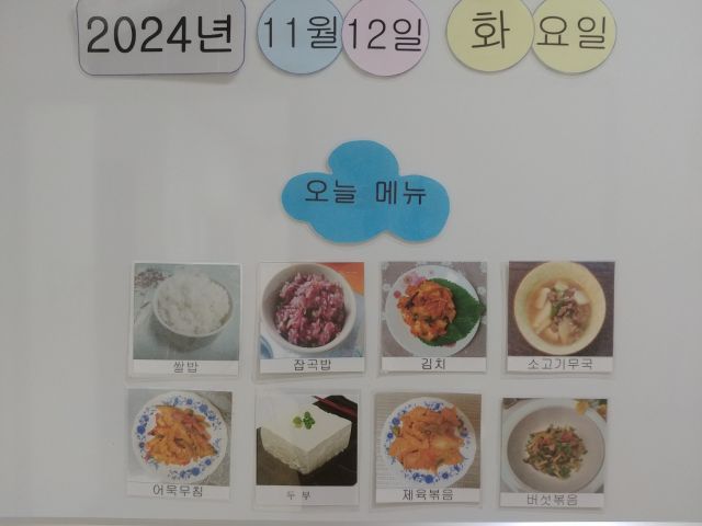 쌀밥, 잡곡밥, 쇠고기무국, 돈야채볶음, 어묵초무침, 버섯볶음, 두부, 김치