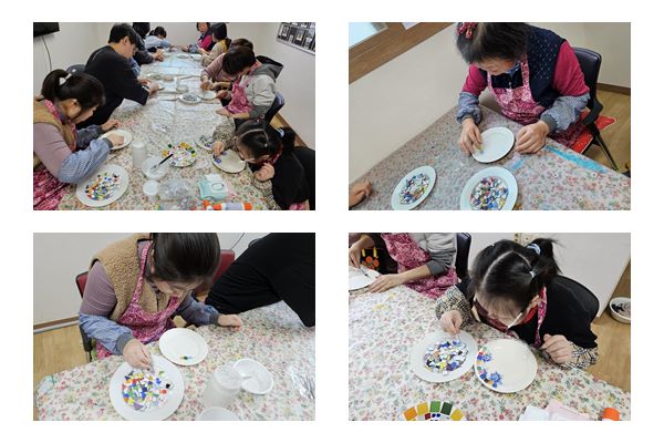 폐접시와 모자이크 타일을 이용하여 냄비받침대를 만들었습니다.