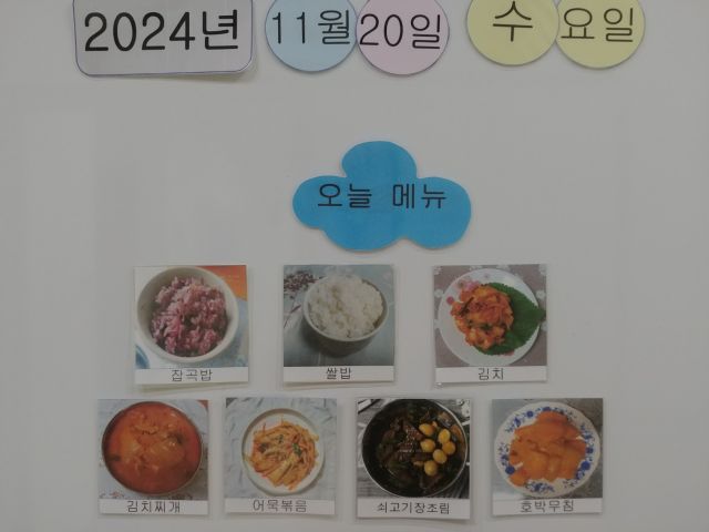 쌀밥, 잡곡밥, 김치찌개, 장조림, 호박나물, 어묵볶음, 김치