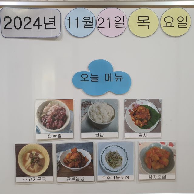 밥, 잡곡밥, 쇠고기무국, 닭볶음탕, 숙주나물무침, 감자조림, 김치