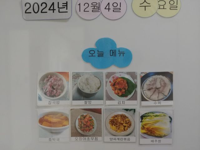 쌀밥, 잡곡밥, 호박국, 수육, 오징어초무침, 양파계란볶음, 배추쌈, 김치