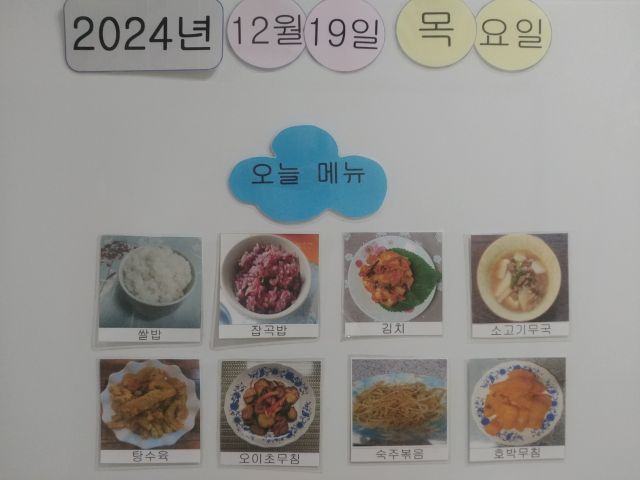 쌀밥, 잡곡밥, 쇠고기무국, 탕수육, 오이초무침, 호박나물, 숙주볶음, 김치