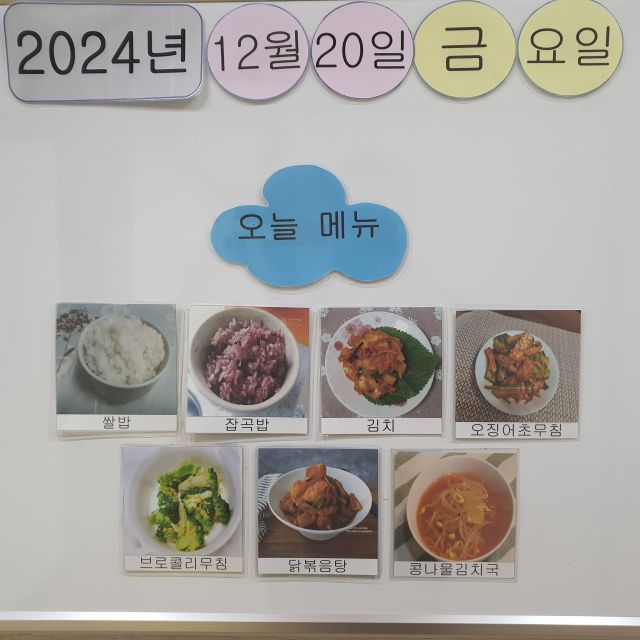 쌀밥, 잡곡밥, 콩나물김칫국, 닭도리탕, 보로콜리 무침, 오징어 무침, 김치