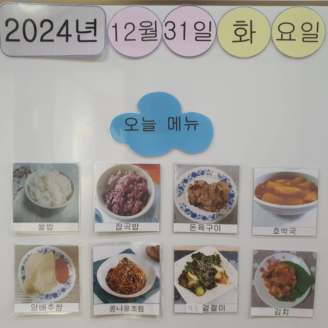 쌀밥, 잡곡밥, 돈육구이, 호박국, 양배추쌈 콩나물조림, 상추겉절이, 김치