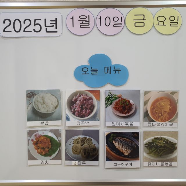 쌀밥, 잡곡밥, 김치, 고등어구이, 김치콩나물국, 군만두, 유채나물볶음, 일미채볶음