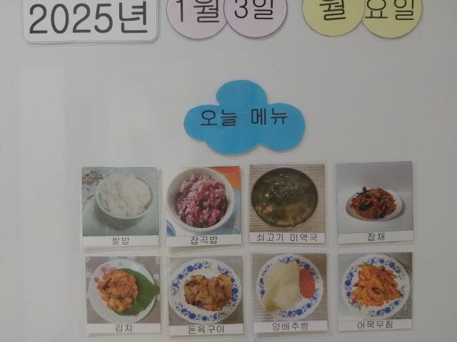 쌀밥, 잡곡밥, 쇠고기미역국, 돈구이, 잡채, 어묵무침, 김치, 양배추쌈