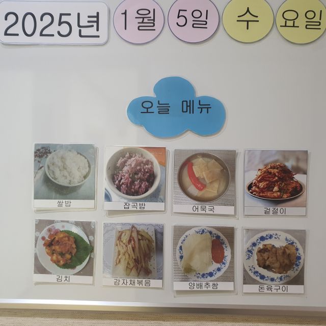 쌀밥, 잡곡밥, 어묵국, 돈육구이, 양배추쌈, 감자채볶음, 배추겉절이, 김치
