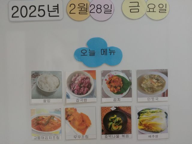 쌀밥, 잡곡밥, 만두국, 고등어김치찜, 무조림, 호박볶음, 김치, 배추쌈