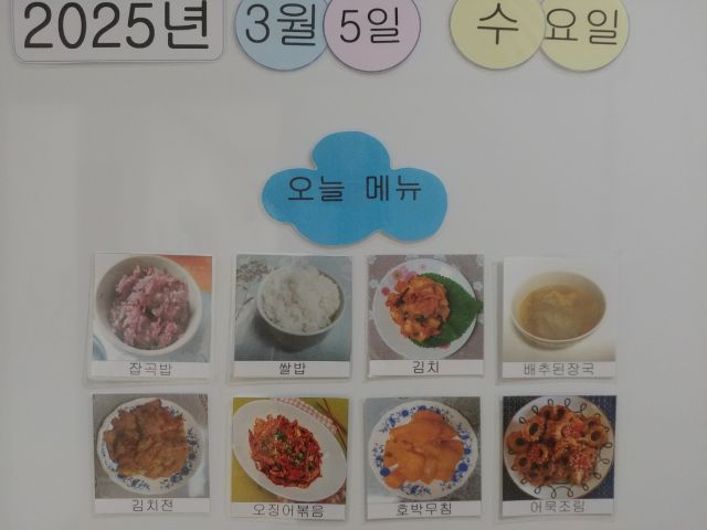 쌀밥, 잡곡밥, 배추된장국, 오징어볶음, 호박무침, 어묵조림, 김치전, 김치