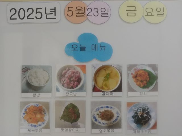 쌀밥, 잡곡밥, 감자국, 돈두루치기, 미역초무침, 멸치볶음, 깻잎장아찌, 김치