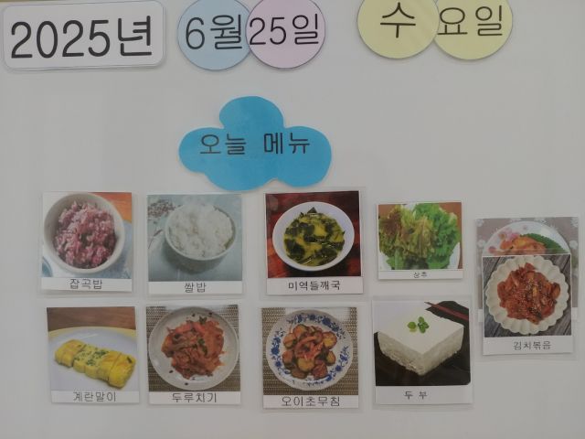 쌀밥, 잡곡밥, 미역들깨국, 계란말이, 두루치기, 오이초무침, 두부, 볶음김치, 상추