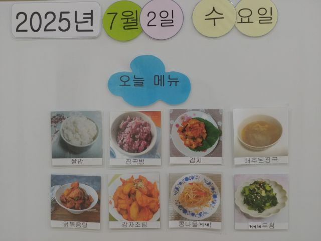 쌀밥, 잡곡밥, 배추된장국, 닭볶음탕, 감자조림, 청경채무침, 콩나물냉채, 김치