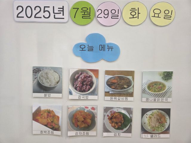 쌀밥, 잡곡밥, 콩나물 맑은국, 갈비찜, 감자조림, 단호박조림, 상추샐러드, 김치