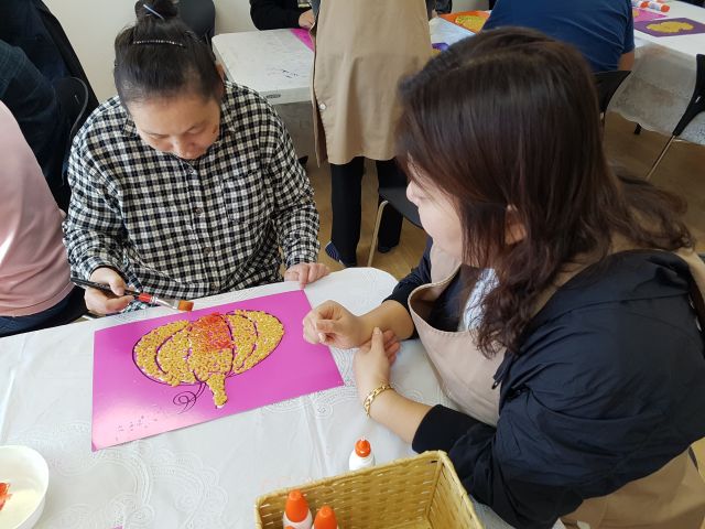 오늘 아트 프로그램 시간에는 마카로니를 이용하여 호박 꾸미기를 해보았어요.