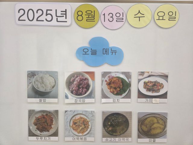 쌀밥, 잡곡밥, 쇠고기 미역국, 두루치기, 가지나물, 어묵볶음, 오이장아찌, 김치