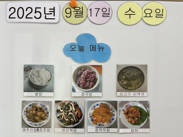 쌀밥, 잡곡밥, 쇠고기미역국, 돈장조림, 메추이랑조림, 버섯볶음, 김치, 호박나물