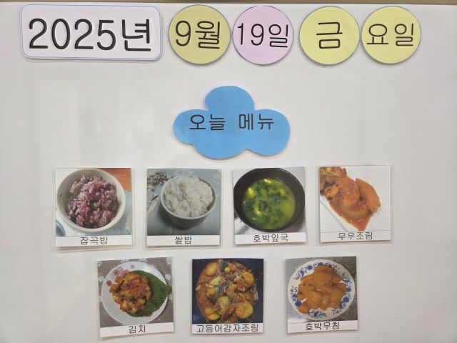 쌀밥, 잡곡밥, 호박잎국, 고등어조림, 감자조림, 무조림, 호박나물, 김치