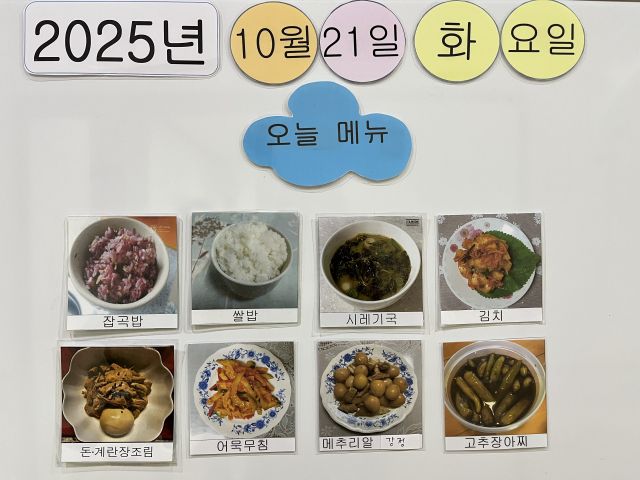 쌀밥, 잡곡밥, 시레기국, 돈계란장조림, 어묵무침, 메추리알강정, 김치, 장아찌