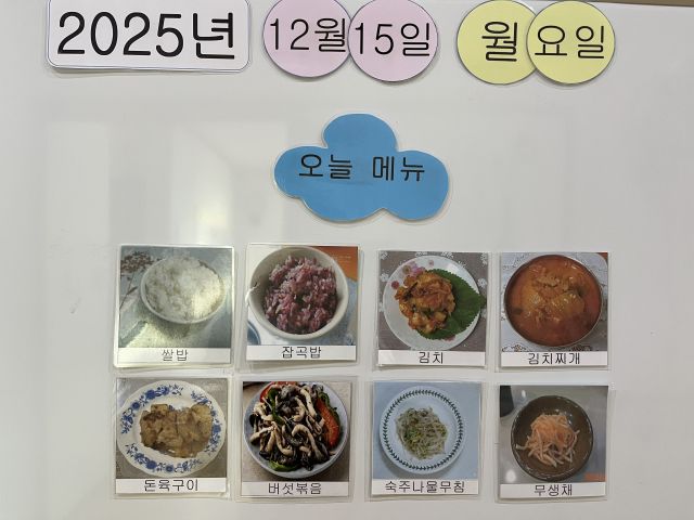쌀밥, 잡곡밥, 김치찌개, 돈구이, 무생채, 버섯볶음, 숙주무침, 김치