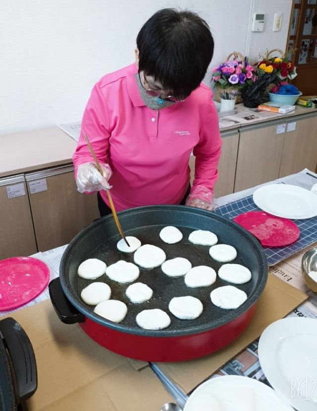 뜨거운 프라이펜은 조심조심 . .내가 만든 찹쌀 반죽이 맛있게 익기를 바라며~~